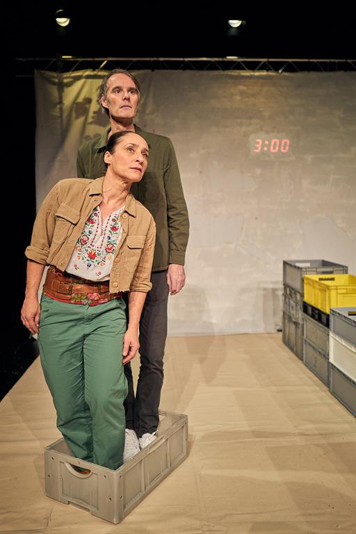 Da sind zwei Schauspieler:innen, die die Magie und die Last des Moments erkunden, auf einer nackten Bühne, auf der eine Uhr rückwärts läuft – 3 Minuten – wieder und wieder und wieder und wieder.